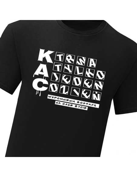 Koszulka z napisem "Kac trwa jeden dzień, wspomnienia całe życie", idealna na wieczór kawalerski dla kawalera lub całej ekipy.