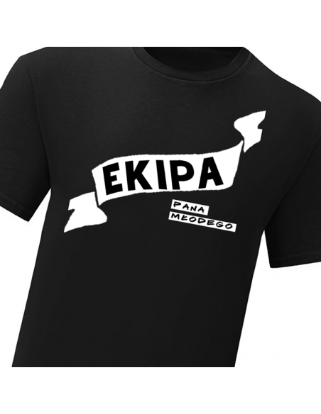 Czarny T-Shirt męski, wykonany w 100% z bawełny. Na wieczór kawalerski dla wszystkich zaproszonych Panów, na z napisem Ekipa pana młodego. Nadruk w technologii termotransferowej, flex