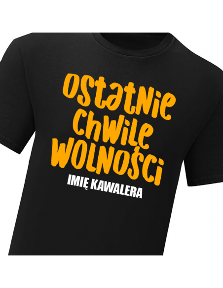 Koszulka męska na wieczór kawalerski lub na prezent dla Pana młodego, z napisem "Ostatnie chwile wolności" z imieniem kawalera. T-shirt w 100% z bawełny, o gramaturze 150g/m2.